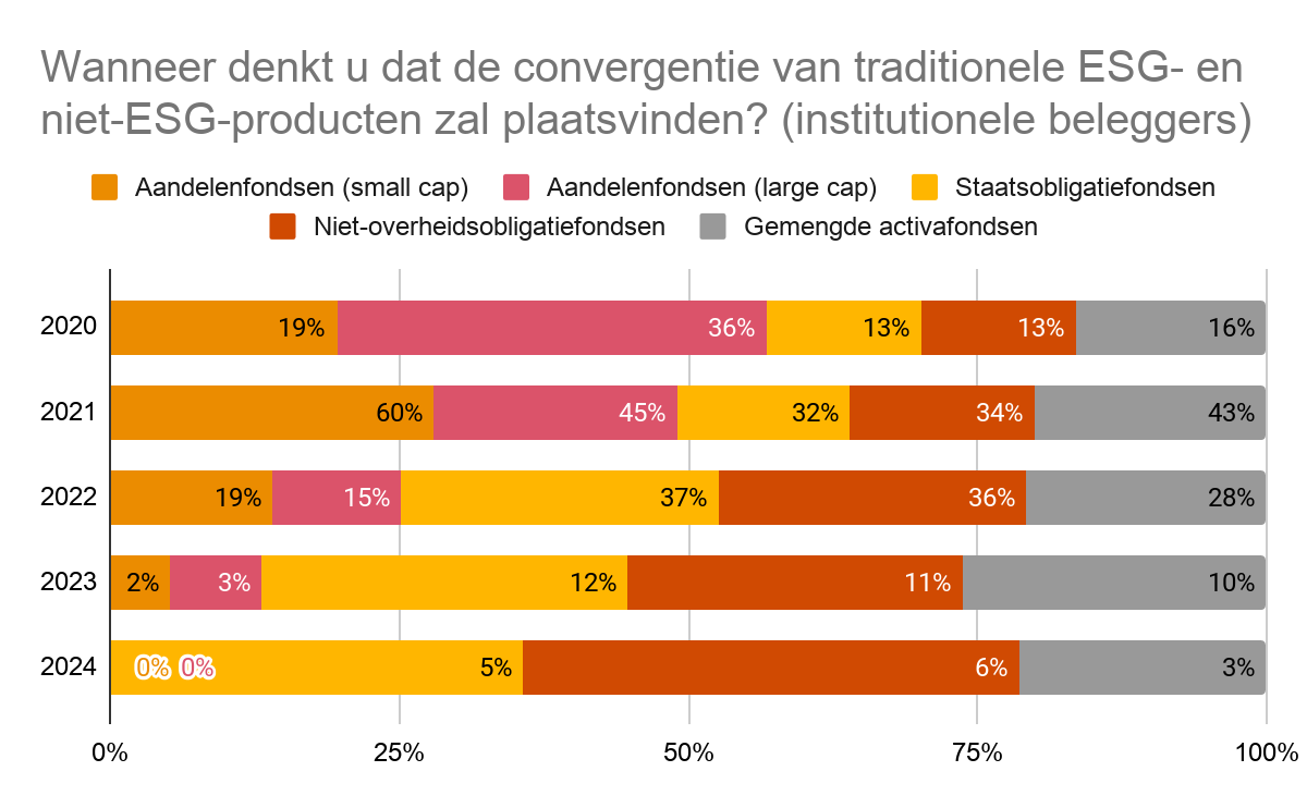 Het zijn beleggers die het voortouw nemen in deze groene revolutie en eisen dat vermogensbeheerders hun kapitaal op een duurzame manier toewijzen. Terwijl zowel het retail- als het institutionele segment een snel toenemende belangstelling voor duurzaam beleggen tonen, toont het rapport dat het vooral de institutionele beleggers zijn die het voortouw nemen. Uit ons onderzoek blijkt dat 99% van de respondenten van institutionele beleggers een convergentie verwachten tussen ESG- en niet-ESG-fondsproducten, waarbij een overweldigende meerderheid verwacht dat dit in 2022 zal gebeuren. Het segment van de particuliere beleggers blijft weliswaar achter, maar zal deze achterstand snel inhalen. Momenteel neemt slechts 41% van de respondenten van retailbeleggers ESG-overwegingen mee in hun beleggingsstrategie.