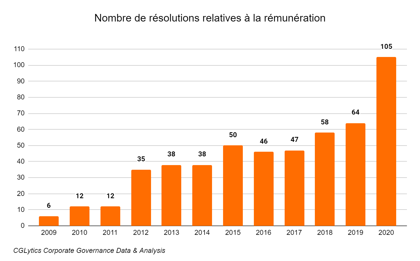 - Les résolutions relatives à la rémunération des dirigeants ont augmenté de 64 % en 2020 et devraient être au centre de l’attention des actionnaires en 2021